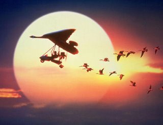 The film also uses a number of feather images: the geese (obviously), a pair of earrings Susan gives to Amy, the feather which triggers Tom’s idea, and several others. The feathers represent flight and freedom, which are the characteristics of growth and maturity, elements which come out in both father and daughter. The image of Amy flying in a “feathered” ultralight also emphasizes her “migration” toward a new level of understanding and awareness.